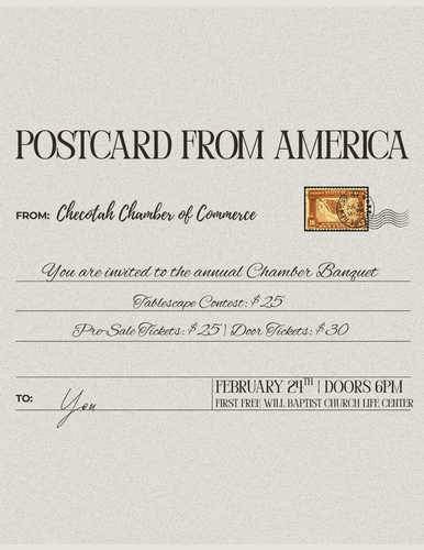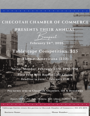 Name: Chamber of Commerce: Annual BanquetDate: February 24, 2026Time: 6:00 PM - 8:00 PM CSTWebsite: facebook.com/checotahchamber