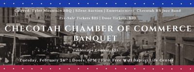 Catering provided by Tyler Mountain BBQ.Location:First Free Will Baptist Church Life CenterDate/Time Information:Tuesday, February 24th, doors open at 6pm, food will be served at 6:30PMContact Information:Checotah Chamber of CommerceFees/Admission:Pre-Sale Tickets are $25